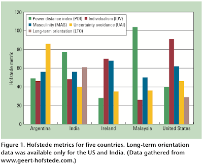The first article came to me via a regular email from the IEEE Computer Society. It was by Phillip Laplante on cultural factors in software development. The article discusses Geert Hofstede’s work on five dimensions of social norms that could be used to characterize any culture. These dimensions are power distance index (PDI), individualism (IDV), masculinity (MAS), uncertainty avoidance (UAI), and long-term orientation (LTO). Each of these dimensions exemplified by choices in software process, for instance: