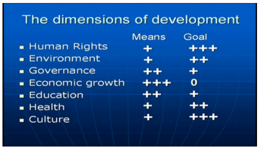 Human rights are especially dear to my heart as a member of multiple minorities. They are a great goal, but a lousy means for development; just because I have rights, it doesn’t mean I’m any less hungry. Economic growth doesn’t seem as exciting to me, as I associate it with business, finance, corporation, globalization, trade, and other things that make me go squick. It is a fantastic means, but money is a lousy goal in life; I can eat well and still not have self determination.